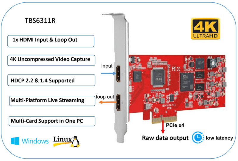 The TBS6311R is a premium 4K HDMI raw data video capture card featuring a single HDMI input. It supports uncompressed, real-time video capture at true DCI 4K resolution (up to 4096×2160p@60Hz). Additionally, its HDMI loop‑out port enables convenient real‑time monitoring of the input signal status.